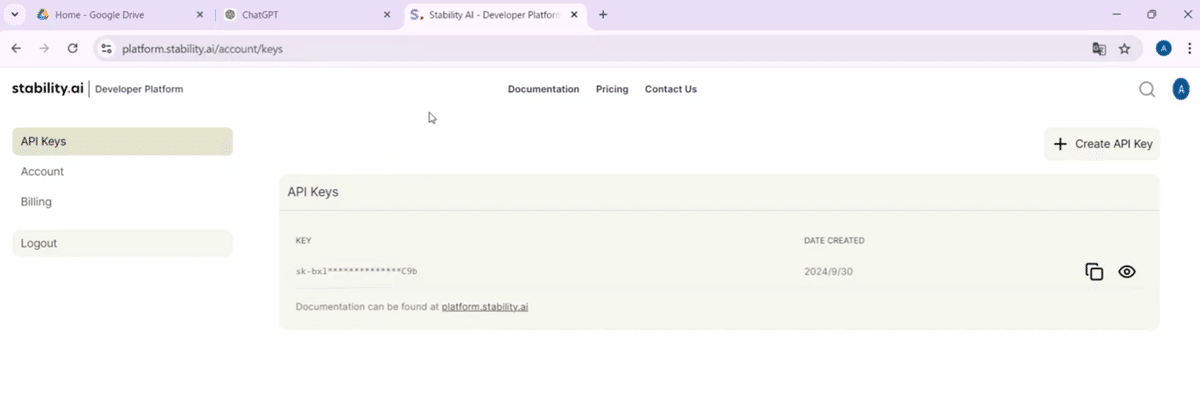 APIキーは、クリップボードにコピーして保存しておきましょう。このキーを使って、Stability AIのサービスを利用します。