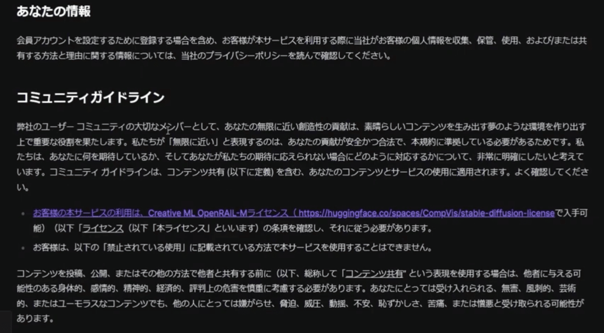 DreamStudioを利用する前に、利用規約をよく読んでおきましょう。特に、無料とはいえ、画像生成の利用規約は、かなり重要です。