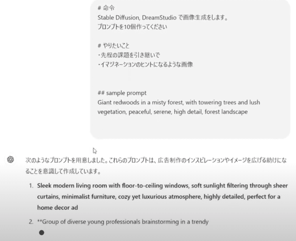 ChatGPTを使うことで、1つのプロンプトをもとに、英語でのプロンプトも難なく大量生成できます。