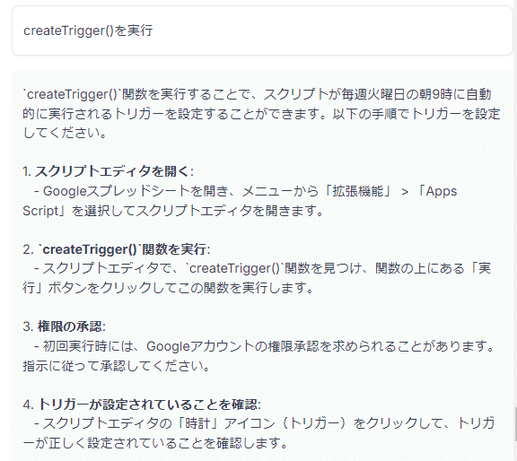 ・実行したい関数が何なのか、軽く指定できるといいのかもしれないです。この例でもdoGetに落ち着くのはいいことかなと思いますが、一方でトリガー設定は実行されていませんでした。実行しようとするとGASエディタからマニュアル操作になるし、権限承認ダイアログもあるのでこれでいいのかもしれません。