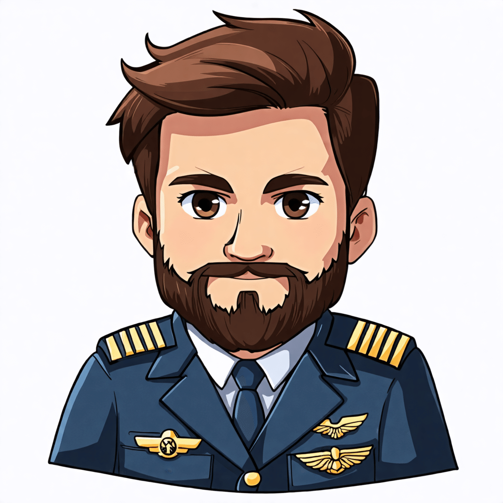 image: Male teacher with a beard who has experience as a flight pilot. Deformed as a chibi character wearing a flight pilot's uniform.