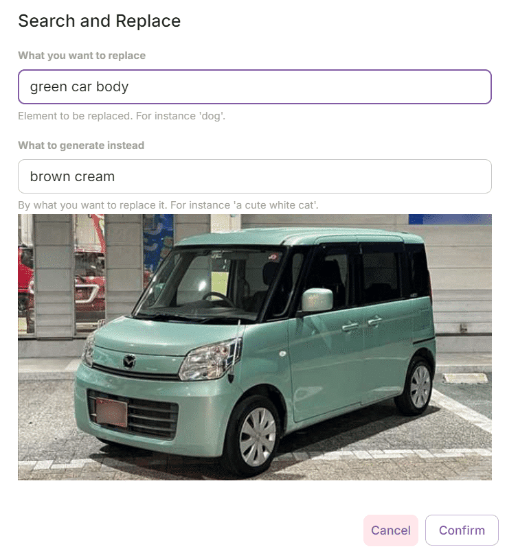 「What you want to replace(置き換えたいもの)」には「green car body」とします。