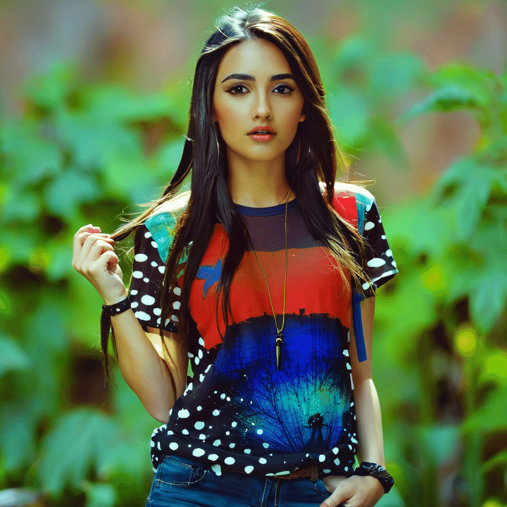 ポジティブプロンプト: 「realistic, photorealistic, 1girl, t-shirt, black_hair, long_hair,」