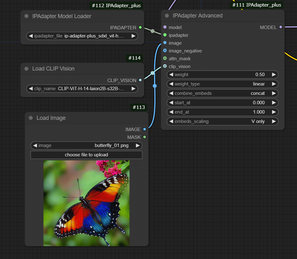 本記事では、IPAdapterの仕組み、ComfyUI上での具体的なワークフロー、そして生成結果を通して、その効果と活用方法を解説します。蝶の画像を参考に人物画像を生成する例を通して、IPAdapterの強度や適用方法による変化、linear、style transfer、ease_inといった異なる重みタイプの効果の違いを検証します。
