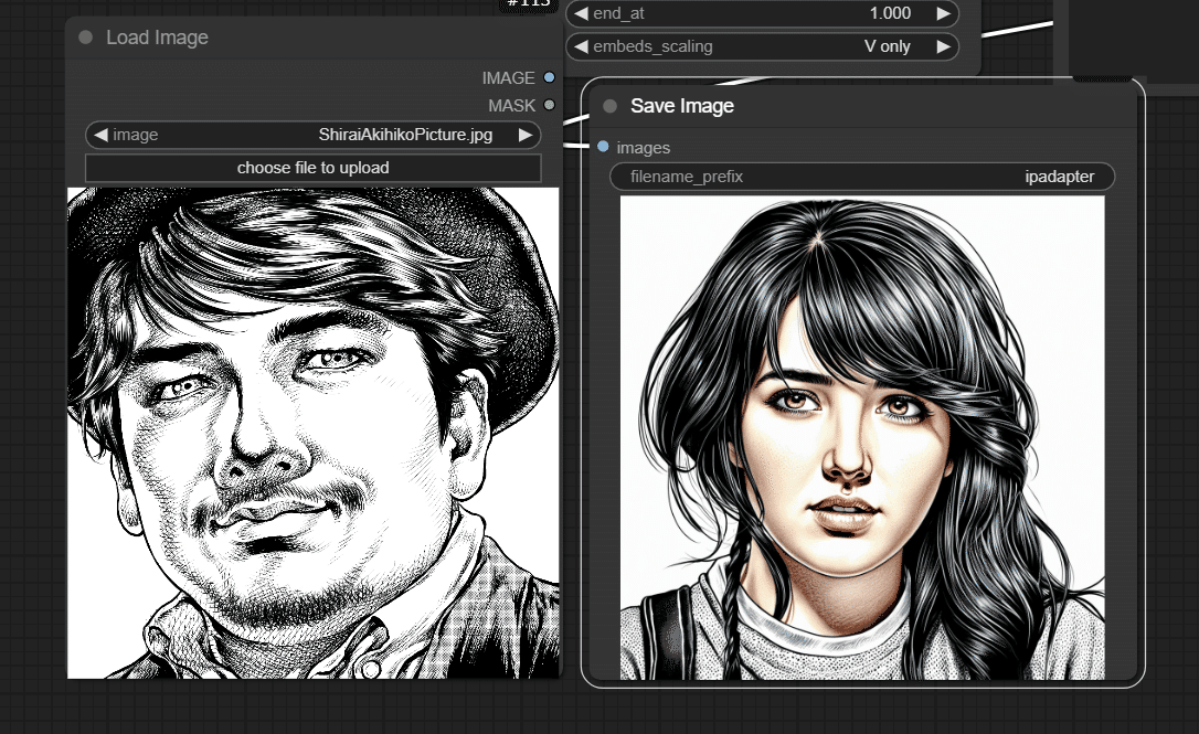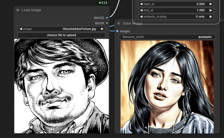 IPAdapter Model Loderと IPAdapter Advancedの拡大です。パラメーターの参考にどうぞ。