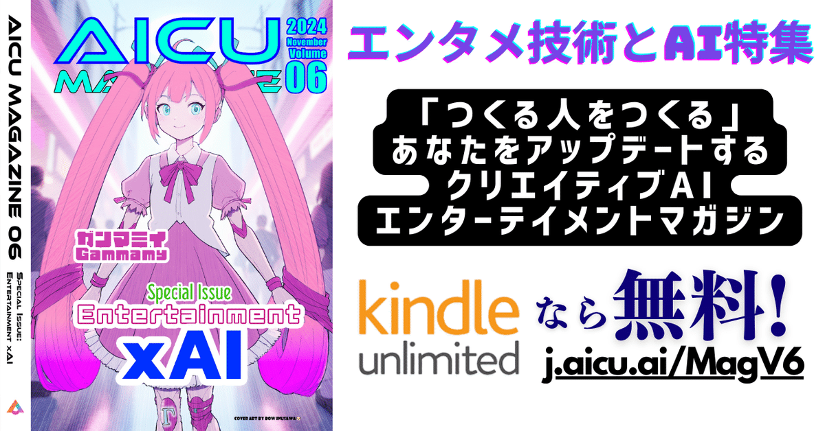 「つくる人をつくる」あなたをアップデートするクリエイティブAIエンターテイメントマガジン「AICU Magazine Vol.6」、KindleUnlimitedで無料配信中です。特集は「Entertainment x AI」。東京ゲームショウで展示された近未来のAI技術、キャラクターデザイン、チャットボット、科学者の先端研究、そして、ゲームAIの研究開発を長年リードされてきた、三宅陽一郎氏(@miyayou)をゲストライターにお迎えして構成しています。