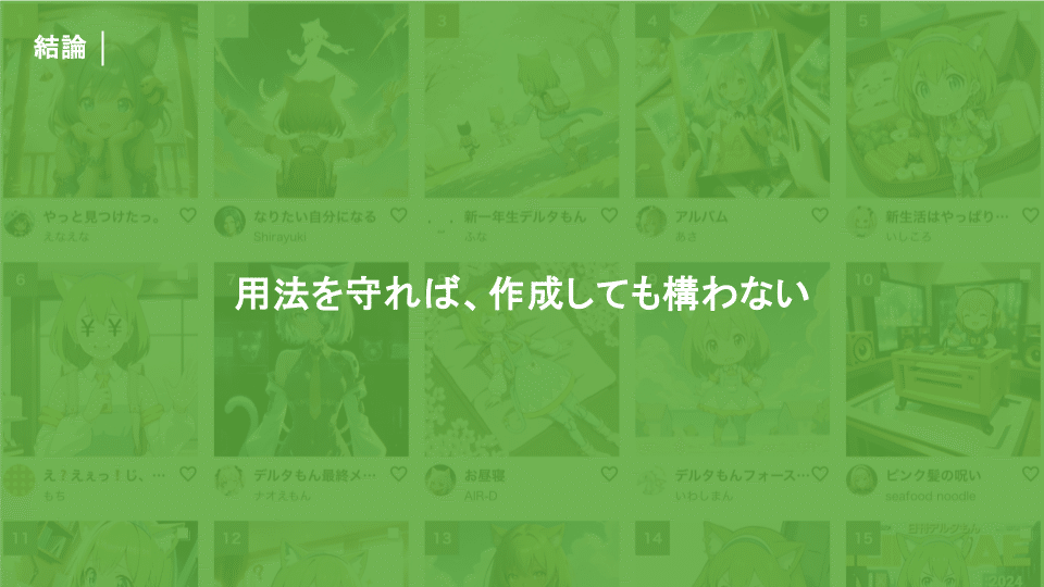 結論から言うと、「用法を守れば生成画像を作成しても構わない。」のだそうです!ちゃんとルールさえ守っていれば使っても全く問題ないとのこと。