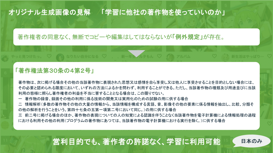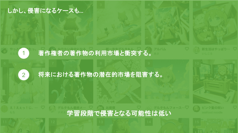 現行の著作権法を読み解くと、生成されたイラストは著作権侵害にならないそうです。学習はどうなるかと言うと、これも許されるとのこと。