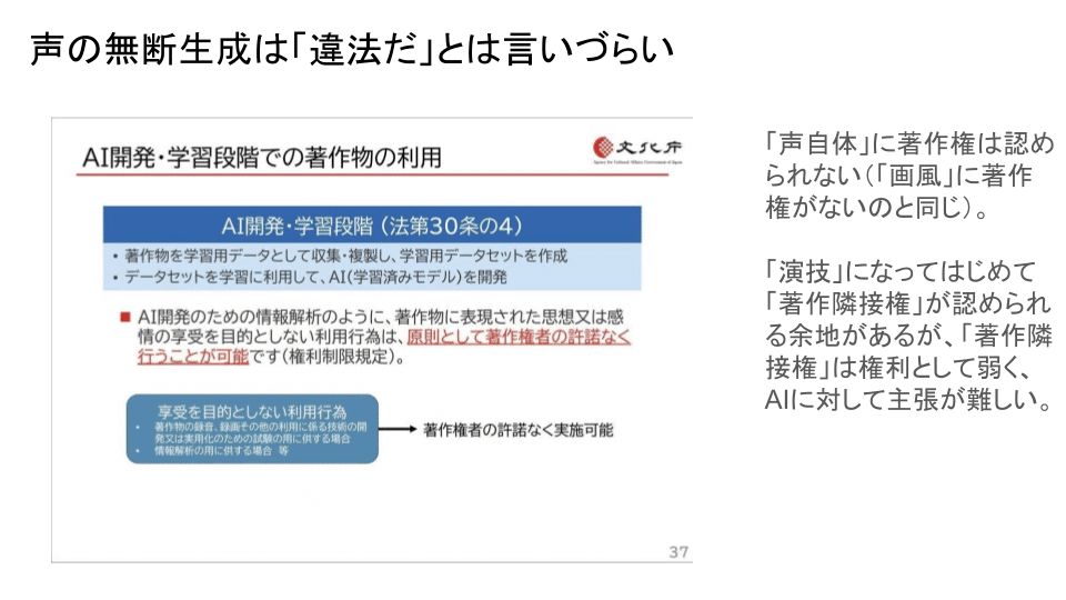 ただし、声で演技をすると著作隣接権が認められる可能性が出てきます。しかし、著作隣接権は著作権より権利が少し弱く、AIに対して主張が難しいです。次の図の左にあるように、著作権法の30条の4には著作隣接権については書いていないので、「我々の利益を不当に侵害してるから声の学習は違法だ」とは言えないのです。
