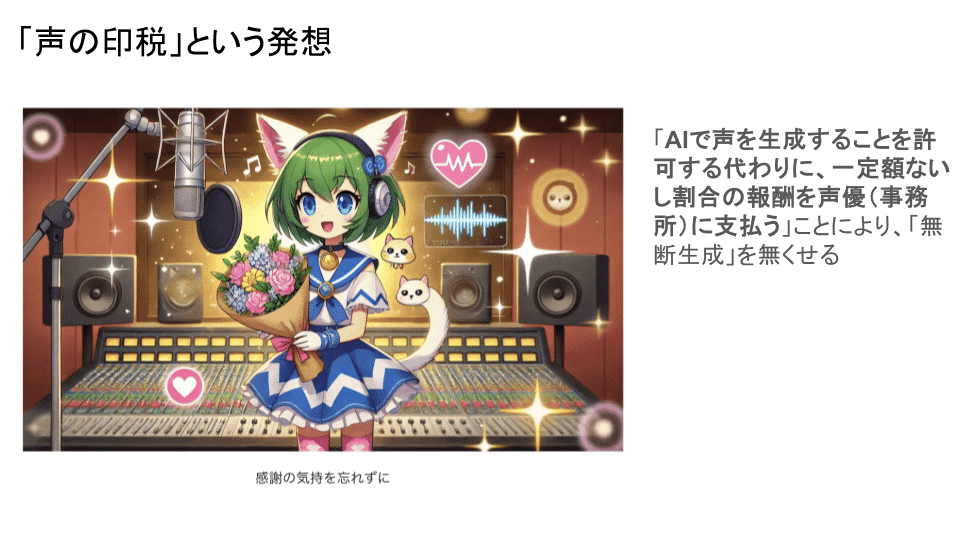 そこで、小宮さんは「声の印税」というものを提案しています。これは「AIが声を学習して生成する許可を出す代わりに、印税のようなロイヤリティを支払うことを声優や事務所に約束する」というもの。これが定着すれば、先ほどのような声優が訴える「無断生成」というものは無くせそうです。実は、文化庁も以前同じようなことを提案しており、法律では解決が難しいけれど、クリエイターと利用者の間で納得できるルールを作った上で解決するのが望ましいという風に言っています。