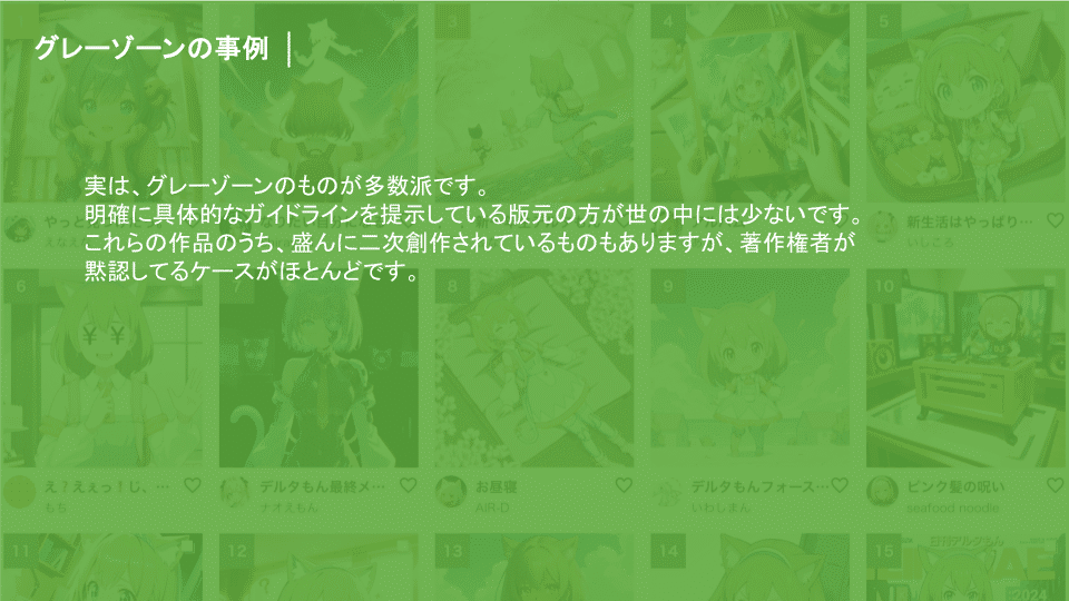 問題は、二次創作や二次利用のガイドラインがない場合です。多くの場合、日本のコンテンツにはガイドラインが存在しません。それゆえに著作権侵害に当たるような形の二次創作なども多く見られます。ですが、訴えられることなく放置される事例もあると思います。