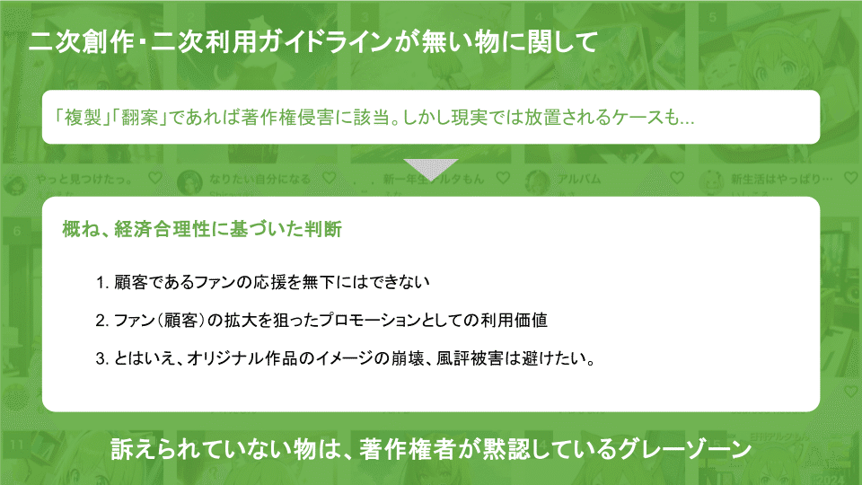 これには、好きで描いてくれているのに「著作権侵害だ!」と言うことができない、つまりファンの応援を無下にできないという事情があります。そして、二次創作などはプロモーションにもつながるため、創作してもらったほうがよいと判断されることもあります。そういった経済合理性があるならある程度は許し、ちょっとやりすぎなのがあったら許さない、といったグレーゾーンとなっているのです。