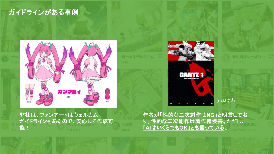 ガイドラインがある事例として、「BlendAI」では、開発した「デルタもん」や「ガンマミィ」といったキャラクターは基本的に商用・非商用問わずAI画像生成を許可しています。また、漫画家の奥浩哉先生は、自身の作品について、性的な表現はNGですが、AI画像生成はいくらでもOKということをX(旧Twitter)で言っていたことがあります。