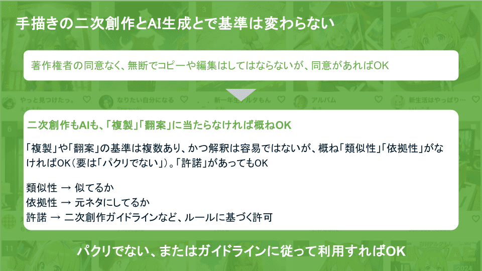 つまりは、パクリとならないよう、ガイドラインに従っていればOKということになります。AI画像も同じです。生成の段階では、手描きと同じことを気をつければ、問題が生じることは少ないのです。