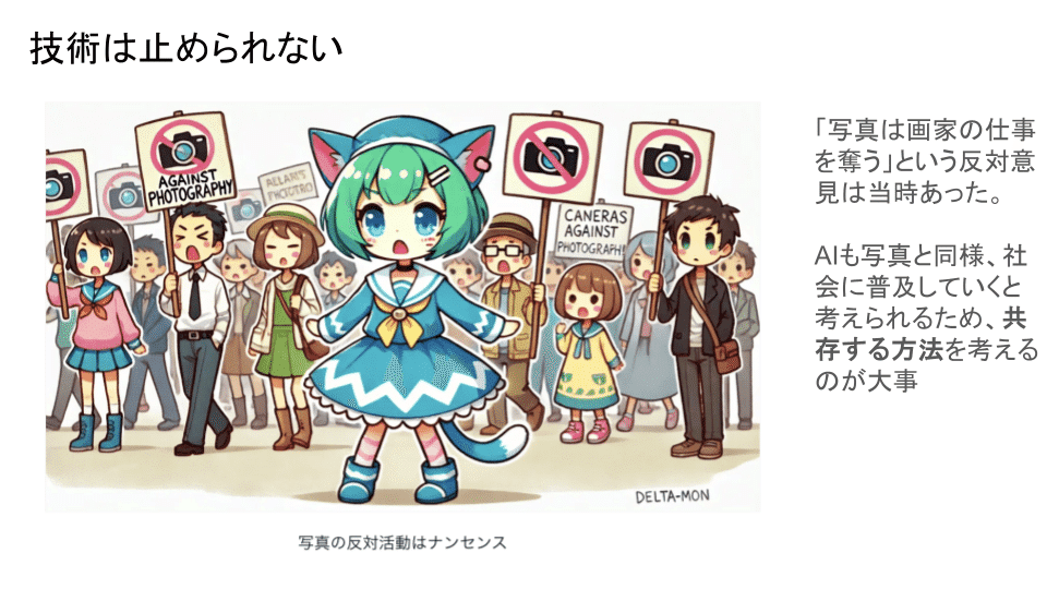 写真の技術が登場した当時は、写真に反対する人もいました。「画家の仕事を奪うとからよくない。魂を込めて書いてるのにそれを無駄する」というような話がありました。しかし、今となっては写真は普及して当たり前に使われるようになりましたよね。AIも写真と同様です。ものすごく便利で有用なものであるので、社会に普及していくのはこれはもう止められないと思います。懸念を示すことも重要ながら、共存する方法を考えるのが大事だと小宮さんは考えています
