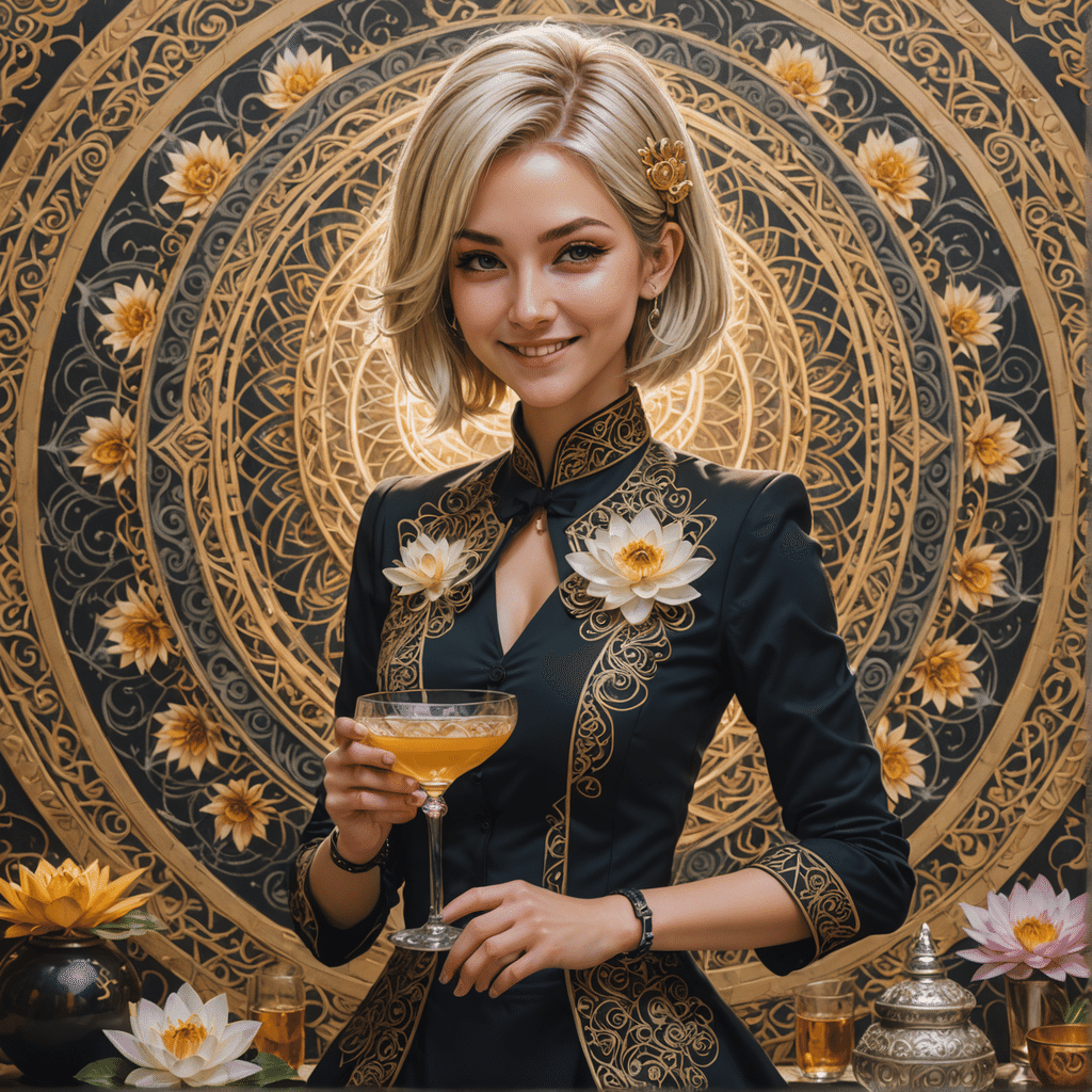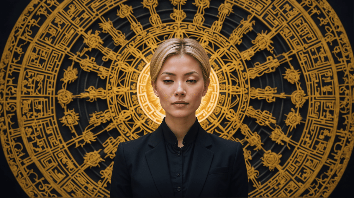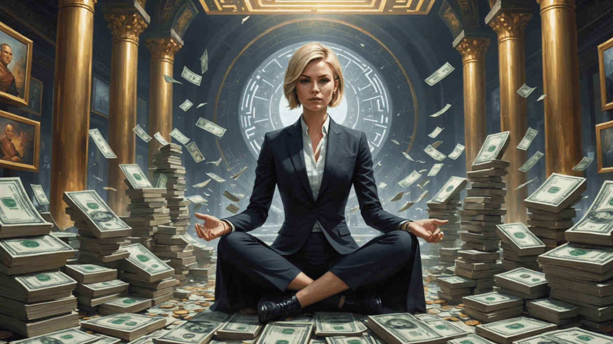 "futuristic buddhist altar, money printing, stacks of cash, blonde short-