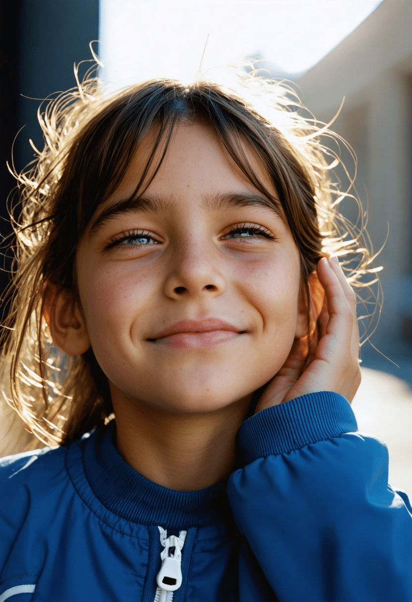 "photorealistic, highly detailed, young girl, squinting, blinded by bright
