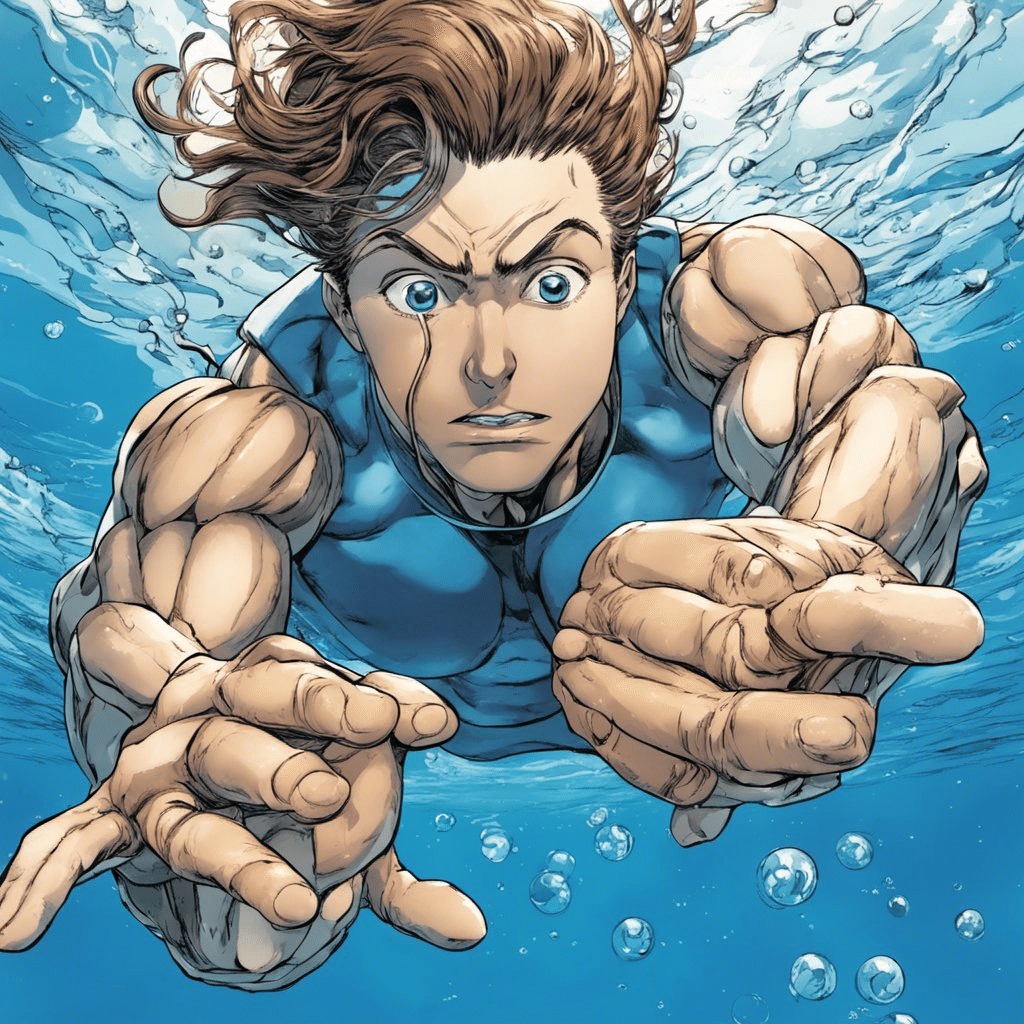 blue water, bubbles, athletic body, dynamic pose, comic shading, manga line