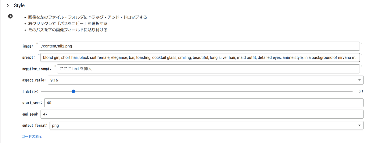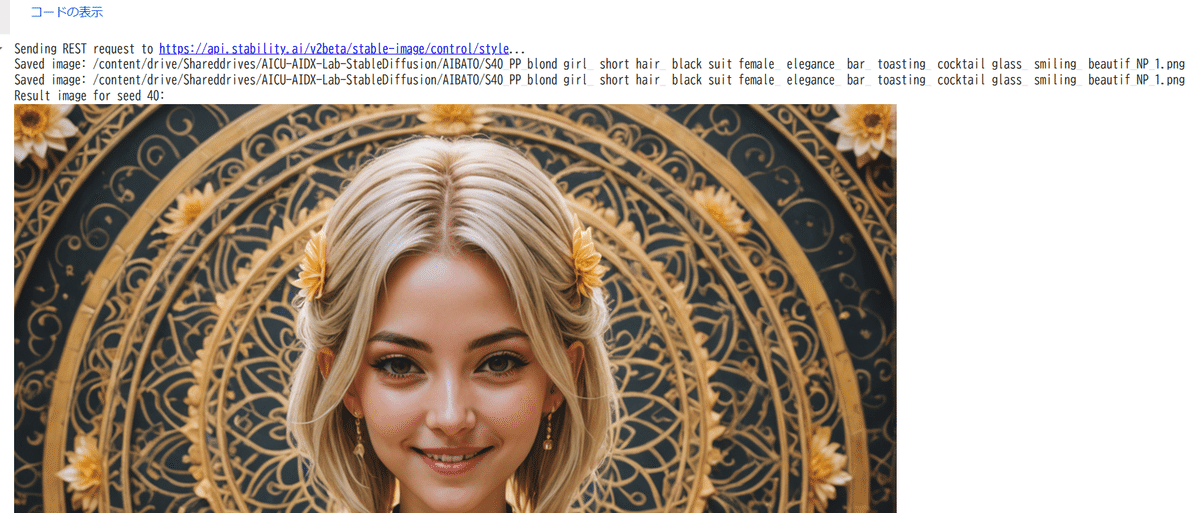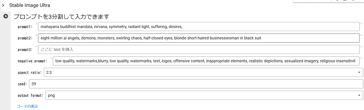 Scriptで書かれており、一番最初のスライド上の各テキストオブジェクトにプロンプトやパラメータを設定するという風変わりなツールになっています。 作品「魑魅魍魎曼陀羅」です。同様の手法で作られていますが、仕上げの段階が異なってきます。 Loading tweet component... Loading tweet component... AICU-Stability-AdGenerator を使った絵作りの利点として、スライド上での評価が高速に行える点があります。写真を比較して差分を確認して、より良い広告を作るためのノウハウは先に述べたとおりですが、表情やスタイルの違いを横断的に評価できます。またレイアウトも自由に検討できます。 [AIBATO]AICU_Coloso1_Original_Tool.ipynb という Coloso第一弾の購入者向けに開発したツールであり、プロンプトを分割して Stable Image Ultraで生成したり、シードを横断的に指定したり、スタイルを学習させることができます。 例えばこの絵は「ニルヴァーナ感は高いですが、平田茉莉花さんのキャラクターとしては神々しさよりももっと邪悪な狡猾さをきちんと組み込んでいきたいな」といった判断があります。大会レギュレーションに沿うと縦長画像を生成する必要がある一方で、ディスプレイとしては横長であり、PCモニタとディスプレイの色味も異なるので、生成しつつもどちらで勝負するかは考えながら審査表示用の画像やツイートなども準備しています。 ツイートに関しては、勝負を馬鹿にしたり余裕を噛ましているのではなく、「余裕時間や区切りを作っている」というテクニックになります。「時間最後までギリギリにやるぞ」と考えていると、画像生成にかかる時間を逆算できなくなりますので、「最後はツイートまでするぞ」と保存やツイートにかかる時間を逆算しつつ、タイムスタンプとしての時系列を記録しています。また後ほどこの原稿のようにタイムラインを振り返るためにも必要な行為です。こうして、制御性の高いプロフェッショナルの絵作りノウハウが積み重ねられていく、以上が解説になります。 以上が基本テクニックです。エンターテインメントとしての生成AIアートバトルを意識して、これまで作ったプロンプトを合体させつつ斬新なコンセプトやウィットの利いたジョークをキャッチコピーと画像のコンセプトに忍ばせつつ、品質の高い制御された絵作りをツイート込みで続けていきます。 最終テーマは「背水の陣」ですが、ここでゼロからの絵作りを勝負するのは良い戦法ではありません。審査員も観客も、すべての手の内を見ておりますので、目も肥えてきます。隠し武器はたくさん持っているのですが、文字通り「背水の陣」であれば、いままで使ってきたテクニックだけでより完成度の高い統合や、世界観、広告としてのエンゲージメントを勝ち取らねばなりません。 特に世界観を支える背景や、キャラクターデザイン、それを支えるモデルやシードは運ではなく、開発して錬成して制御していく要素なので、短い時間で緊張感のある現場ですが、丁寧にログが残る形でGoogle Colabノートブックで生成しています。 リクエストはREST APIによって行われ、繰り返し構文「For」を使ってシードやフィデリティパラメータを調整していきます。ファイル名にプロンプトやパラメータが残るようになっています。 一見余裕を噛ましているように見えますが、こういうときは「この系は一旦終わりにしよう」という意味でもあります。 Loading tweet component... Loading tweet component... なお、表情の探求についてはプロンプトとスタイル制御で行います。このあたりは細かいところはColoso動画で紹介しています。 これは「半目閉じ」を指定しつつ、背景に魑魅魍魎が足りなかった、また曼荼羅としての方位を示す要素が甘かった、などで没になった画像です。このような画像の評価もGoogle Colabは便利ではなく、Google DriveやSlidesを使うように連携しています。 最後の方は秒単位まで集中していますので、コピーライティングとしての文字や漢字のトンマナ調整、レイアウトなども整理させていただくとこんな感じになると思います。これもGoogle
