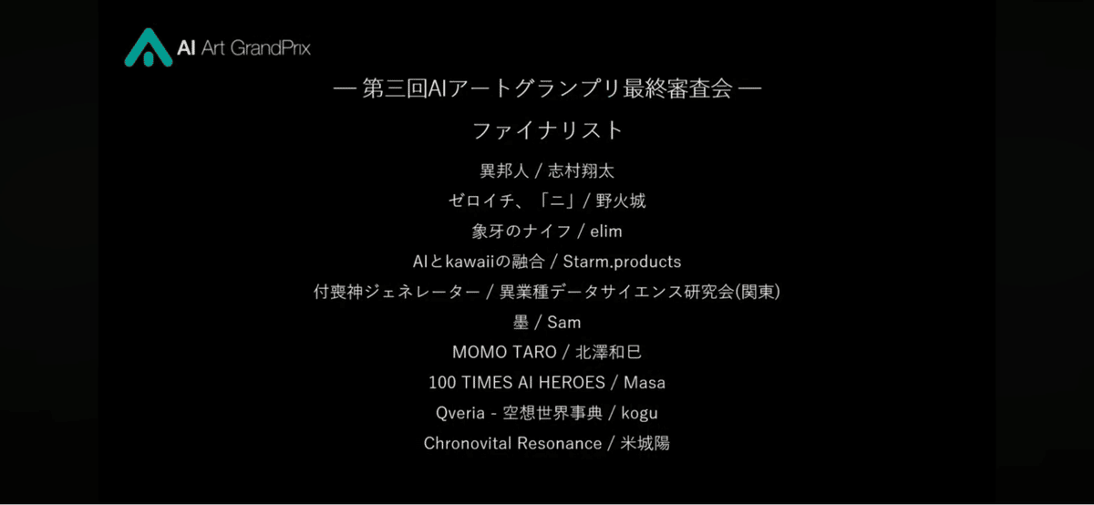 :先ほどのプレゼンテーション動画でもざっくりと申し上げたのですが、音楽の持つポテンシャルを最大化したいという風に大きく考えていて、その中でも私の専門と合わせて、音楽が持つ人の健康に対するポテンシャル、癒しを得られたり、元気を得たりといったそういったポテンシャルを高めたいというところがすごく大局的な部分にあります。そのためのその一歩としてバイタルデータを音楽のパラメータに結びつけることで、今回の作品ではリアルタイムではなく私がコードを実行することで作った曲ではあるんですが、この曲をリアルタイムで音楽に変換することができることがスモールステップといったところです。 <hikonyanの感想> 「第3回 AIアートグランプリ」の最終審査である、ファイナリストたちによるプレゼンテーションの様子をお伝えしました。どの作品も制作者の意図や想いが詰まった、未来の AIへの期待感が高まるような発表ばかりでした。 誰がどの賞を受賞したか気になる方は、結果発表の様子をまとめた記事を公開中ですのでぜひご覧ください! また、今回の審査会の様子は AI アートグランプリの公式チャンネルに動画がありますので、気になった方は動画もぜひご覧ください。 最後までお読みいただきありがとうございます。 https://note.com/aicu/n/na039bbc559ba AICUでのAI関連イベント取材依頼はこちらから https://note.com/aicu/n/n9a7ee531e36f この記事への感想は X@AICUai へのメンションをつけていただけますと幸いです。分厚いレポートを書いてくれた AICU編集部
