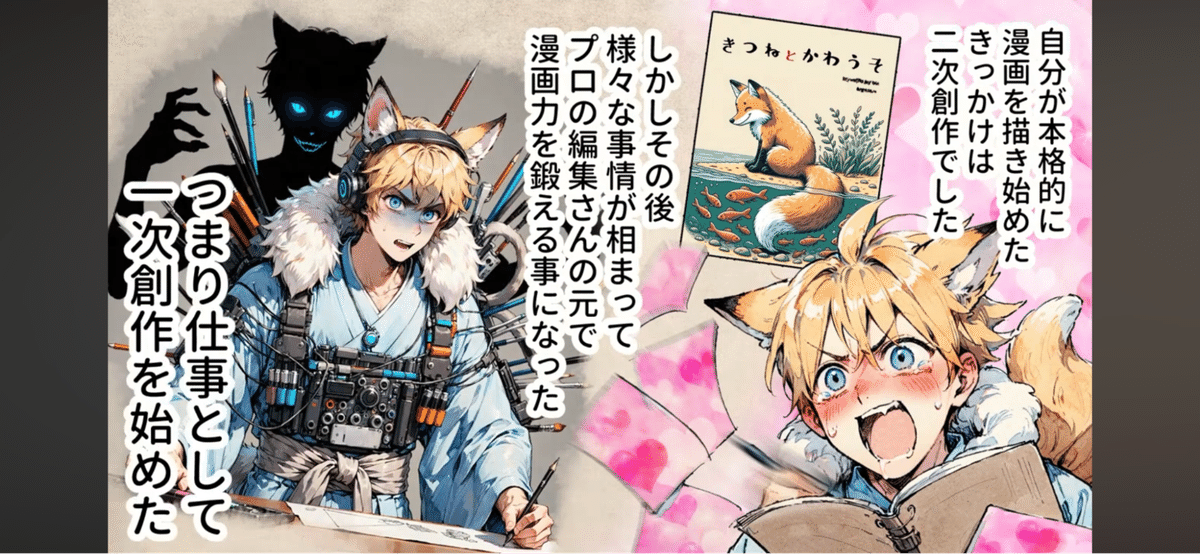 「自分が本格的に漫画を描き始めたきっかけは、二次創作でした。しかし、その後、さまざまな事情が相まって プロの編集さんのもとで漫画力を鍛えることになった。つまり、一次創作を始めた。一次創作と二次創作は全然別物だと思っていたが、実際やってみるとそうでもなかった」