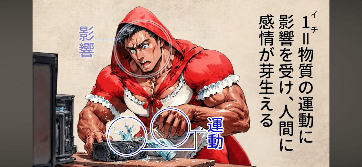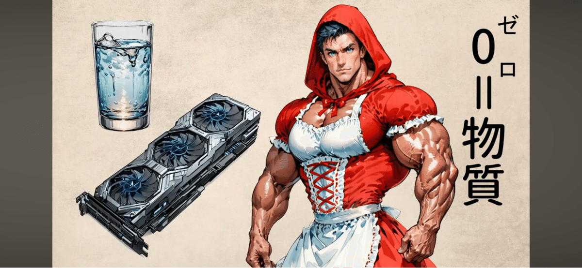 「スタートが二次創作だった自分には、一次創作は「現実」を原作にした二次創作という感覚がある。つまり、ゼロイチ、ニを図にすると、ゼロ=物質。イチ=物質の運動に影響を受け、人間に感情が芽生える。ニ=自分の感情を表現したい「欲」が発生。欲が高まると「創作」を始める。人間の「欲」が強くにじみ出る「創作」は人の心に刺さる。そして2022年、画像AI が一般人にも使えるようになる。AI が自動で生成する創作に「欲」は乗らないが、AI を使う人間には欲がある。特に AI を取り巻く現在の環境は、人間の「欲」まみれだ。己の「欲」と改めて向き合う良い機会だと思った」