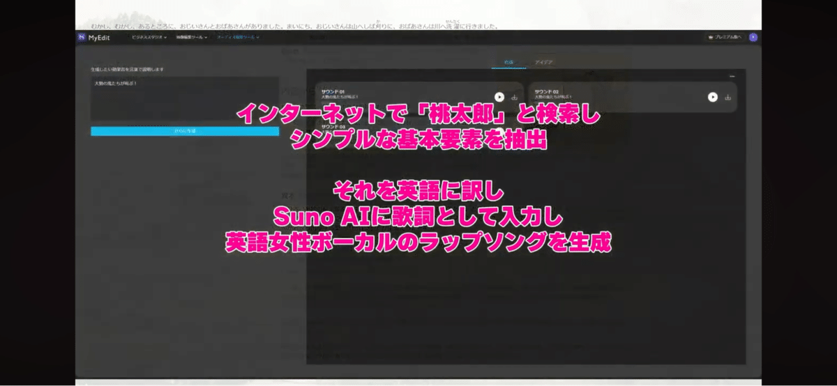 になります。動画生成も同じRunWayのほうが相性がいいなと感じています。プロンプトに入れて漫画的な表現、クレイアニメーションな感じをかなり試行錯誤して作りました。AfterEffectsで並べて、カラコレやレンズエフェクトなどを入れつつ、音と合体させて動画として完成させました」 「今回桃太郎の諸々のストーリーを英語のラップにして面白おかしく楽しめる、親しみがある、温かくなる 生き生きとした動画を目指して作りました」 <審査員による質疑応答> 諏訪