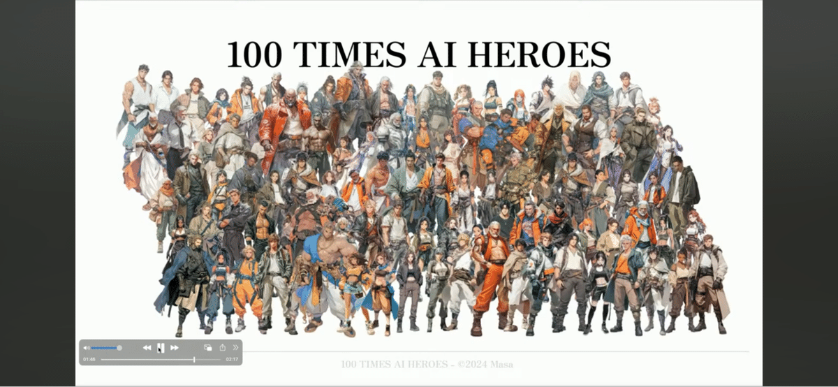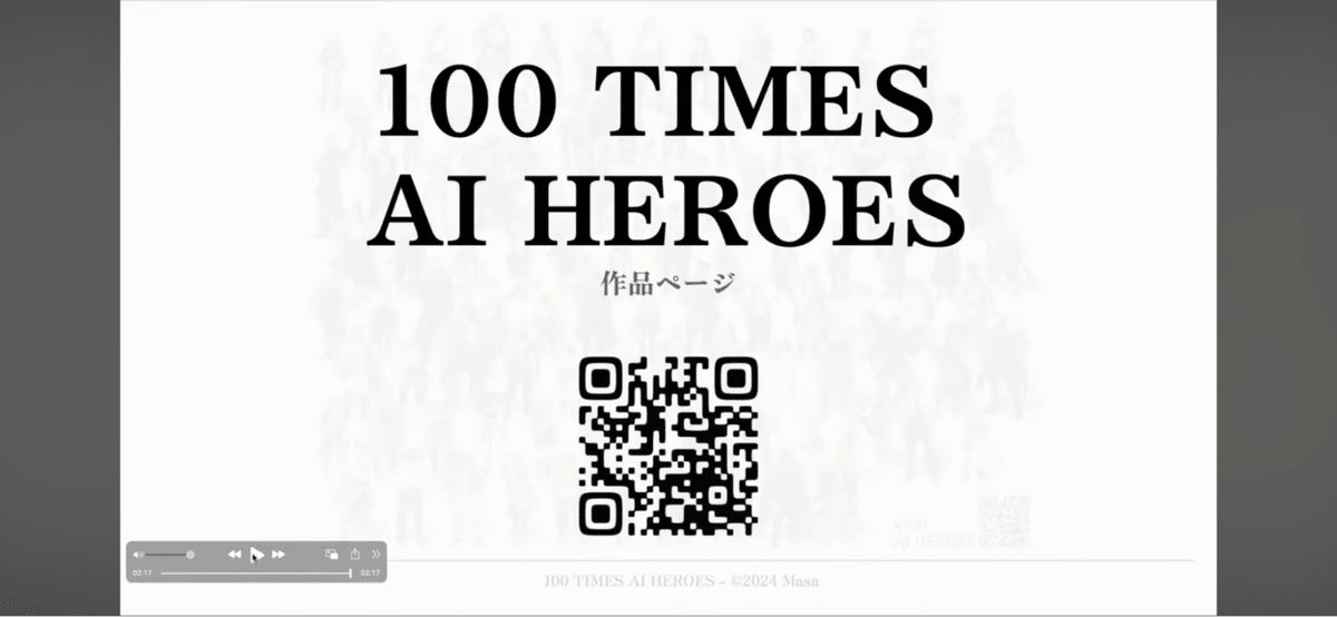 可愛らしいクレイアニメーション風な作品も AI でここまで表現できる、しかも6月から AI生成を始めたばかりで、というのが驚きでした。なかなか難しい様子ですが、日本らしい作風のクレイアニメーションも見てみたいですね。8.100 TIMES AI HEROS/Masaさん