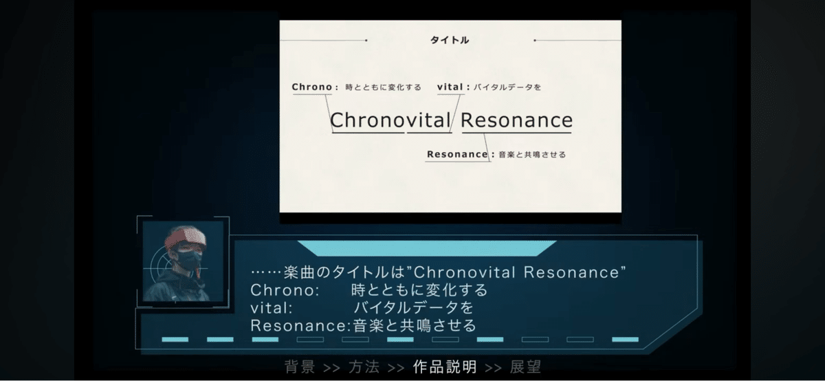 事典を作るという発想もそうですが、 AIで創作していく中で分厚い世界が必要だろうと思い至るまでのお話がとても興味深いですね。紙の事典だと数年がかり、時には何十年がかりで作ると聞きますが、全体で何ページ分あるのか、どこまで細かく定義されているのか、制作にかかった期間など気になることがいっぱいです。10.Chronovital Resonance/米城陽さん