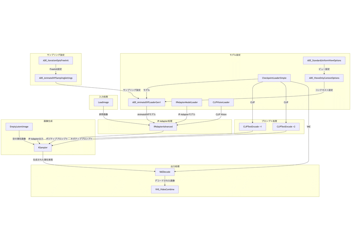 以下がワークフローの全体像になります。このワークフローは、入力画像の特徴を活かしながらアニメーション動画を生成する高度な例です。IP-Adapterを使用することで、入力画像の視覚的特徴(この場合、若い日本人女性の外見)を生成プロセスに組み込みます。AnimateDiffとの組み合わせにより、入力画像に基づいた一貫性のあるアニメーション動画が生成されます。