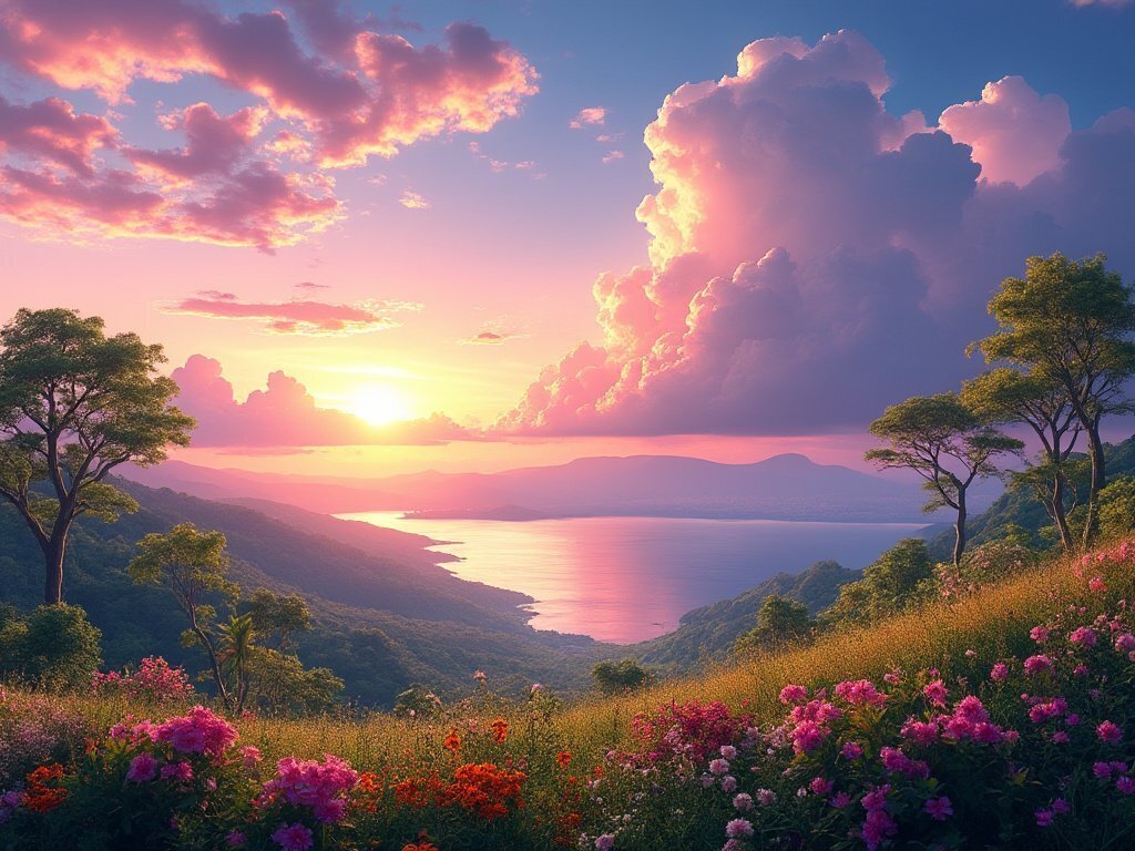wide landscape view, sunset, golden hour, large clouds, pink sky, ocean in background, water reflections, distant mountains, lush green trees, flowers in foreground, gentle breeze, glowing sunlight, ethereal atmosphere, serene, soft lighting, cinematic composition, high detail, vivid colors, dreamy, fantasy setting