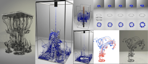 こちらは今年のTPFFのトレーラーにて注目Technical Papersにも選ばれていた研究です。この研究では、インク拡散シミュレーションを扱っています。忠実度の高いシミュレーションが、2つの粒子系を結合してシミュレーションを行う手法によって可能になったとのことです。ここではパーティクル(粒子)フローマップという、パーティクルの動きの情報を持ったフローマップシステムが使われています。既存のフローマップの技術では粘性や抗力などの散逸力の扱いに限界がありましたが、本研究はそれらの課題を克服しています。