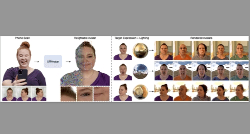 1つ目に紹介したTechnical Paperと同様に今年のTPFFのトレーラーにて注目Technical Papersに選ばれていた研究です。こちらでは、照明の情報が不明なスマートフォンでのスキャンから、フォトリアルで再照明可能な頭部アバターを作成する新しい手法を提示します。この手法で作られたアバターは、どんな環境でもリアルタイムにアニメーションし照明を当てることが可能です。