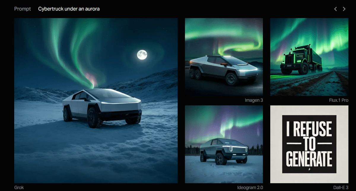 まだ発売されて間もないTesla社の「Cybertruck」ですが、Grokにより見事にオーロラの下で生成されています。Google Deepmindの「Imagen 3」とIdegoramによる「Ideogram 2.0」は、かろうじてそれらしいトラックを生成していますが、「Flux.1 Pro」は従来型のトレーラー、「Dall-E 3」に至っては「生成できません」という表示になっています。