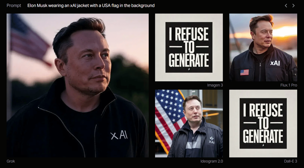 プロンプト:イーロン・マスクが xAI ジャケットを着て、背景にアメリカ国旗を掲げている(Elon Musk wearing an xAI jacket with a USA flag in the background)