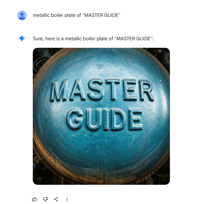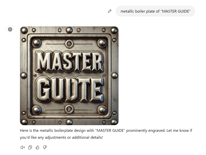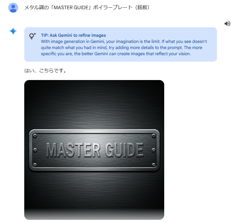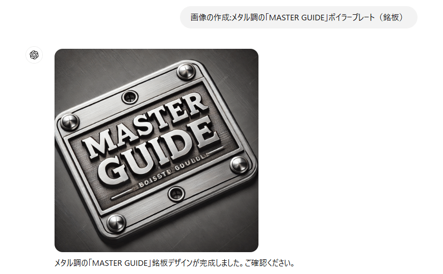 プロンプト「画像の作成:メタル調の「MASTER GUIDE」ボイラープレート(銘板)」