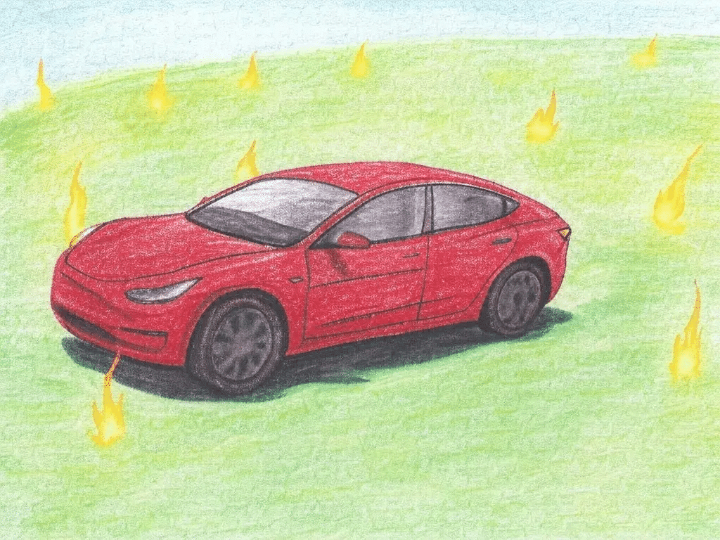 Crude crayon drawing of a Tesla driving through a fiery meadow