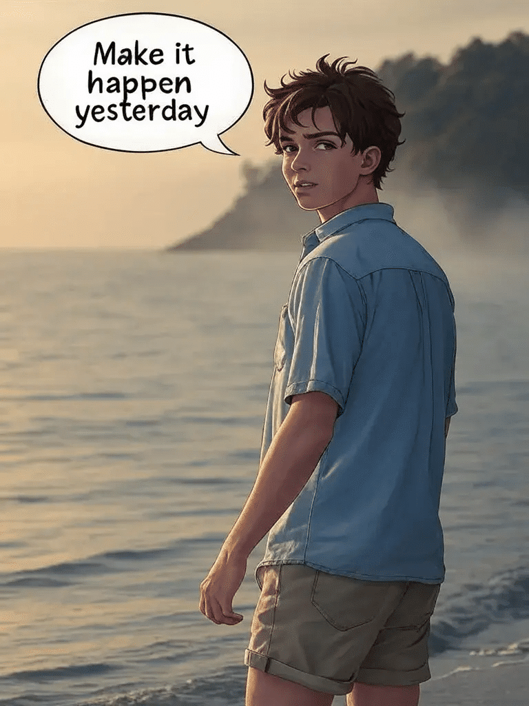 A comic of a young man standing by the sea, looking back and saying "Make it happen yesterday."