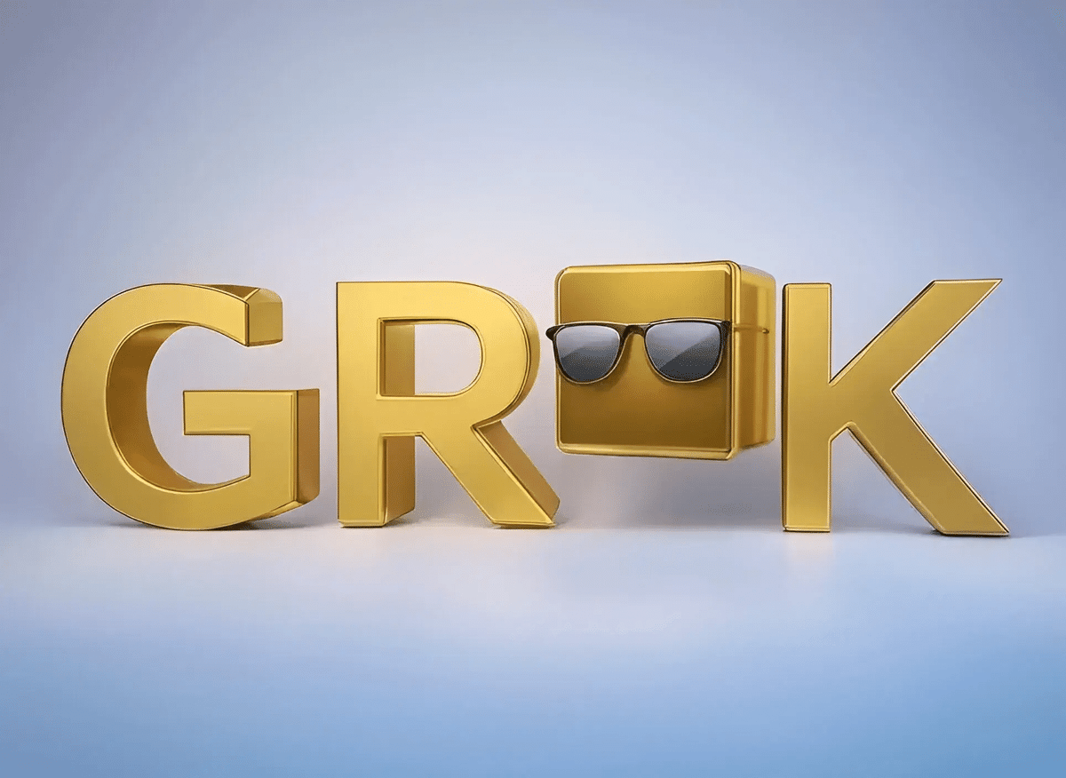 Generate a creative logo for "GROK" with a golden color and sunglasses