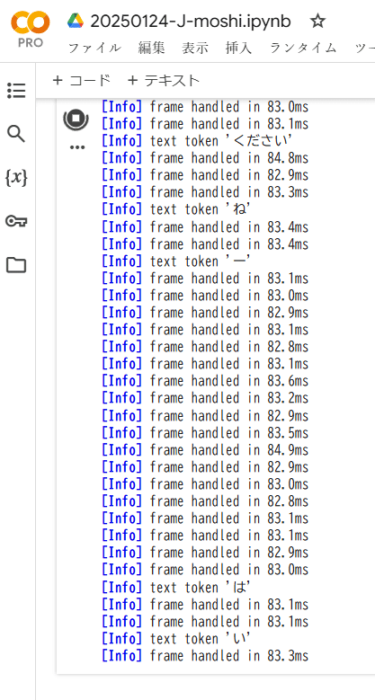 extの学習では,テキスト対話コーパスから音声合成された拡張データも使用しました.使用したコーパスは以下の通りです: 音声対話コーパス 雑談対話コーパス(内製) 相談対話コーパス(内製) テキスト対話コーパス Loading tweet component... Loading tweet component... 会話は発話のオーバーラップや相槌など、人間同士の対話におけるような自然なターンテイキングをリアルタイムに実現していることが体験できます。J-Moshiの学習済みモデル(nu-dialogue/j-moshi-ext)だけで推論された全二重の会話が生成されています。LLMではないので知能的な反応ではありませんが相槌のリズムなどは非常に自然です。コードの提供いっさいなく、moshiにHuggingFaceのモデルをロードするだけで実現している点も評価できると考えます(論文は後日公開されるそうです)。これはAITuberや、お年寄り向けの対話エージェント、そして会話の前の「えーと…」といったフィラーの生成で、時間がかかる大規模な言語モデルとの連携などに活用できる可能性があり、大きな貢献となりそうです。 なおJ-Moshiが生成した音声のサンプルはこちらからご覧いただけます。 J-Moshiは試作段階であり,その応答は不自然な場合があります.また,J-Moshiの学習データの大部分は雑談対話であるため,ユーザの指示に従った応答を生成することはできません. ログに表示されている opus(ブラウザの音声ストリーミング)の1サイクルの処理速度は84msecぐらいです。つまり秒11サイクルぐらいの速度でトークンを生成しています。 ローカル環境などで研究する場合、更に高速化したいならこちらの144行目をコメントアウトするといいかもしれませんね。 https://github.com/kyutai-labs/moshi/blob/main/moshi/moshi/server.py Google Colabの L4 GPUでの動作で、VRAMは17GBぐらい消費しています。 用途をデジタルサイネージなどに限定すれば、コンシューマGPUなどでも動くかもしれませんね。 これからも研究の発展を期待します! 本記事はAICU Japanしらいはかせが検証しました。 以下は、Google Colabでの動作するコードです。 この記事の続きはこちらから https://note.com/aicu/n/nc1b1a911caf4 Originally published at https://note.com on Jan 24, 2025.Google Colabで使ってみよう