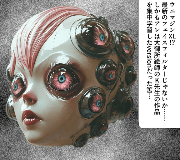 これはYOUKAIを始める上で最初のハードルでした。何せホラー漫画の怪物なので可愛かったらダメなわけです。只、ウニマジンは「画像生成AIの怪」なので美しさは残しつつも、絶妙な「生理的嫌悪感」を生成で出すにはどうすれば良いか。