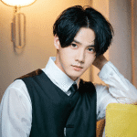 A young man with fair skin and black wavy hair, styled in a middle part, sitting in a modern indoor setting. He has deep, expressive eyes and a soft yet confident expression. He is wearing a white dress shirt with a black vest and tie, giving him a refined and elegant look. His pose is relaxed, with one hand resting near his head. The background has warm lighting, with a stylish lamp mounted on the wall and a cozy yellow cushion beside him. The atmosphere is sophisticated and inviting.