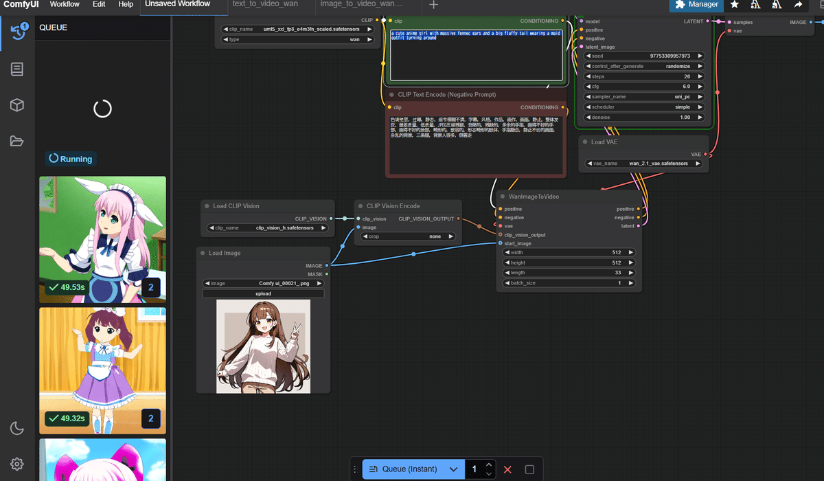 ワークフローについては公式のワークフローをベースに、ロードするモデルは最小の「wan2.1_t2v_1.3B_bf16.safetensors」をロードしています(Google