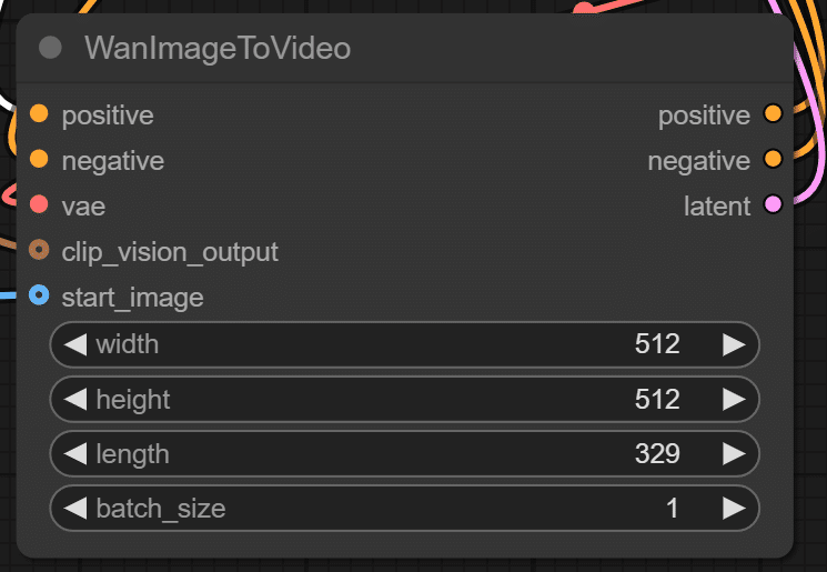 WanImageToVideoノードの Width, Hight 512に続く「length」を329にしてみます。