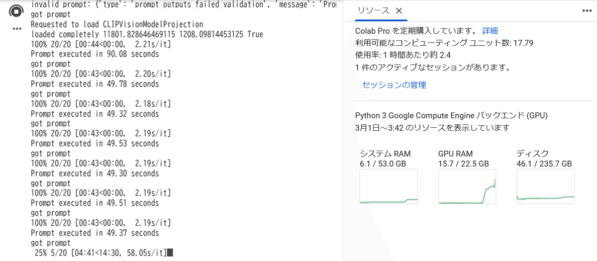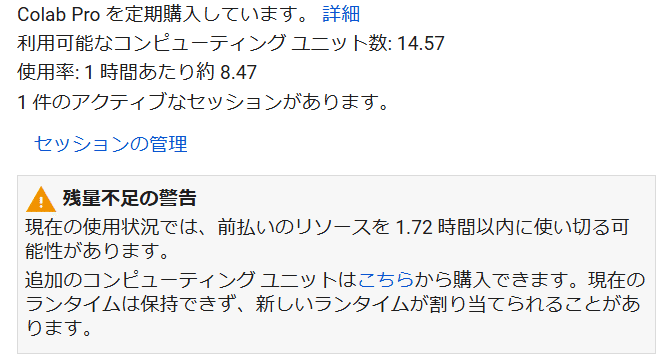 料金的には100CUで1179円なので、1時間あたり99.9円。T4の5-6倍の値段です。ただし、インストールをしたりダウンロードをしている時間もCUを消費しますので、まずは実験をするのであればL4の20GBや、T4の15GBを使って試してみるのががよいでしょう。