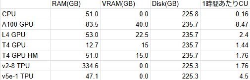 こちらが2025年2月末時点でのGoogle Colab Proで利用できる環境の一覧です。