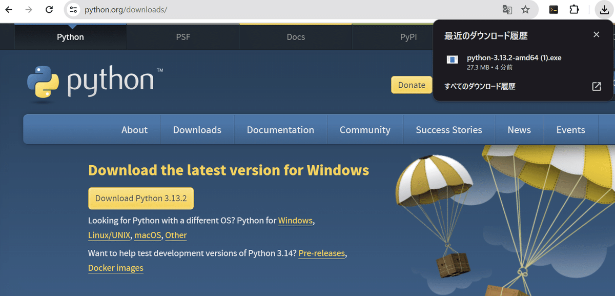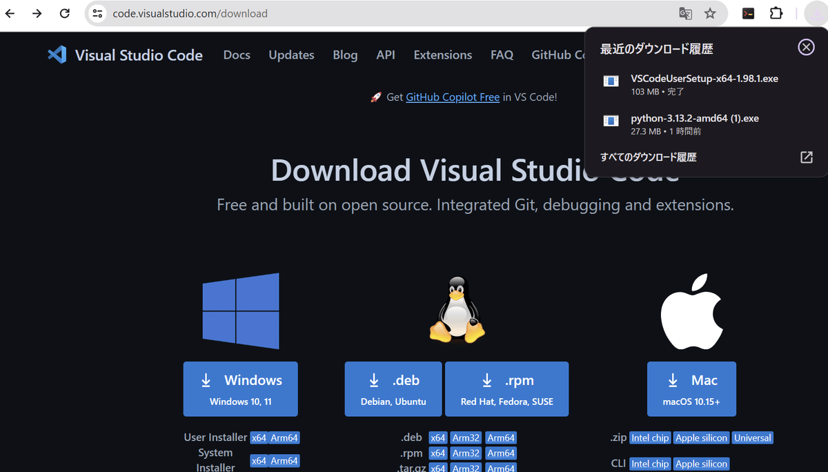 Python、VSCodeのインストーラをダウンロード