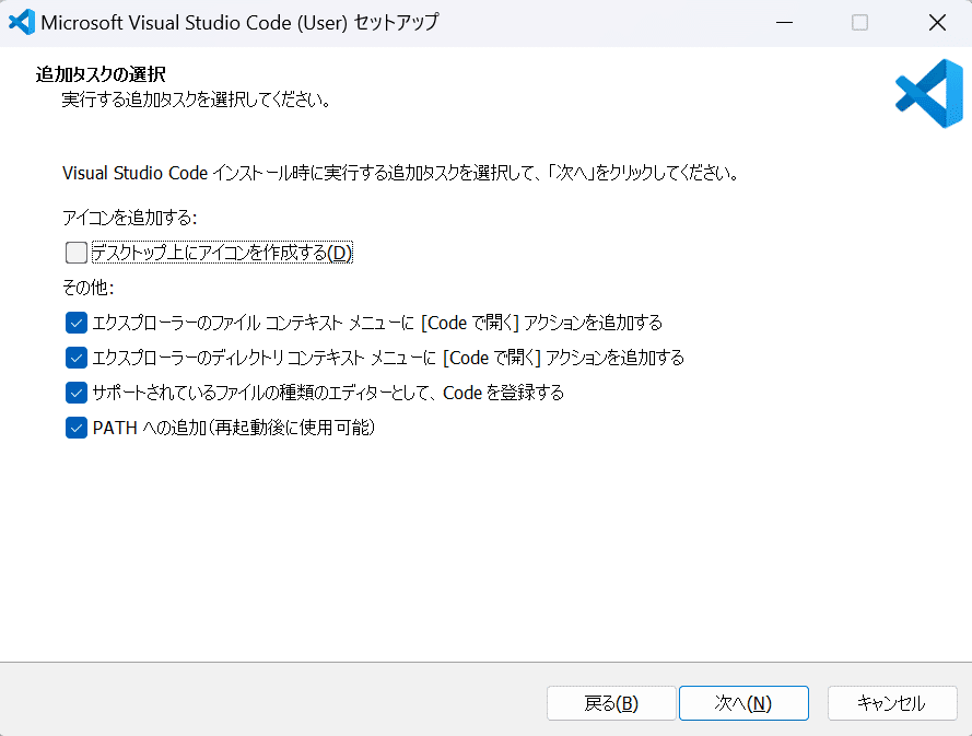 ↓追加タスク:「サポートされているファイルの種類のエディタとして、Codeを登録する」「PATHへの追加」にチェックを入れておき、「次へ」を選択