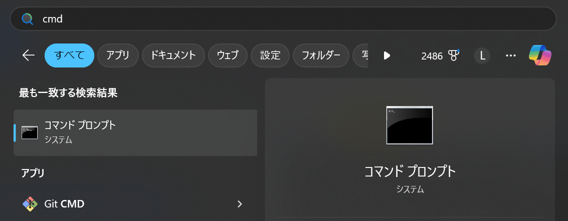 スタートキーから「cmd」と入力し、コマンドプロンプトを起動させます。