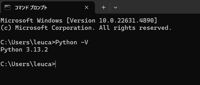 コマンドプロンプトが起動したら、「Python -V」と入力しましょう。